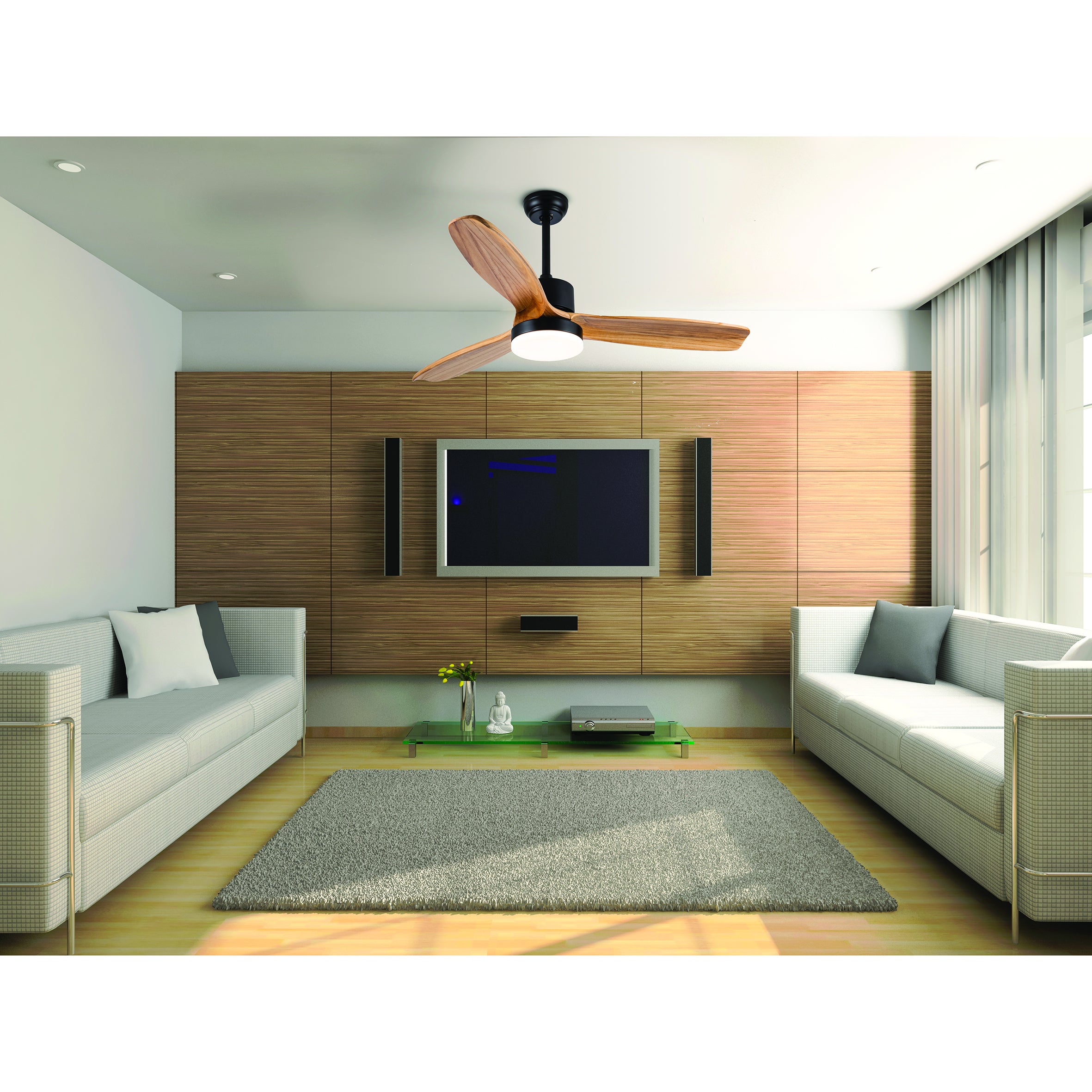 Ventilatore da soffitto con corpo in metallo in finitura scura e legno naturale. Con motore AC Include temperatura luce regolabile e timer, con possibilità di funzione estate/inverno. Ampia zona di illuminazione che distribuisce molto bene la luce nella stanza.. Motore AC. Telecomando incluso. Luce a LED