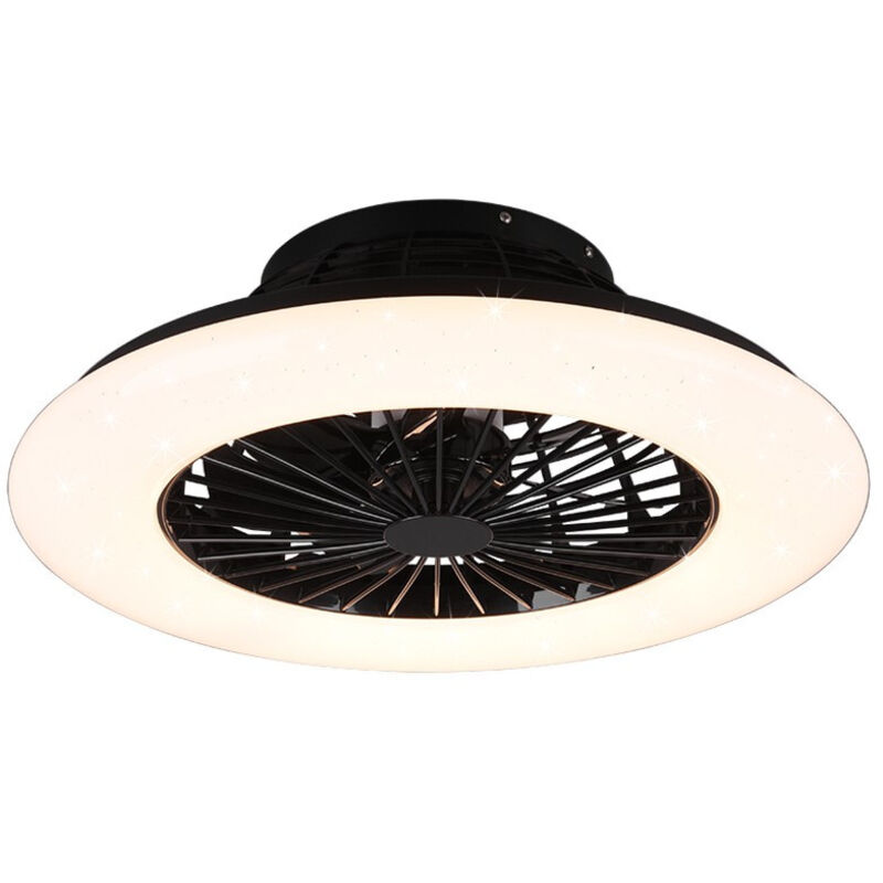 STRALSUND di Trio Lighting é un ventilatore da soffitto rotondo con struttura in plastica di colore nero opaco e diffusore bianco. Diametro 50 cm. Diffusore con effetto cielo stellato che rende questa lampada unica e affasciante. Dotata di modulo led integrato SMD LED 30 watt, resa luminosa 2200 lumen, 3000k - 6500k (luce calda, fredda e naturale). Dimmer integrato. Tramite il pratico telecomando in dotazione é possibile accedere a diverse funzioni come la regolazione di intensità e temperatura colore della luce (3000k - 4000k - 6500k), l'attivazione luce notturna e il timer per l'accensione/spegnimento automatico in orari prestabiliti. Non compatibile con dimmer esterno. Le diverse fonti luminose possono essere accese e spente indipendentemente le une dalle altre. Tecnologica e moderna, questa lampada a ventilatore oltre a raffrescare l'ambiente permette di illuminare medi e grandi stanze in modo totalmente personalizzato e diffuso. Perfetto ad esempio per la camera da letto, il
