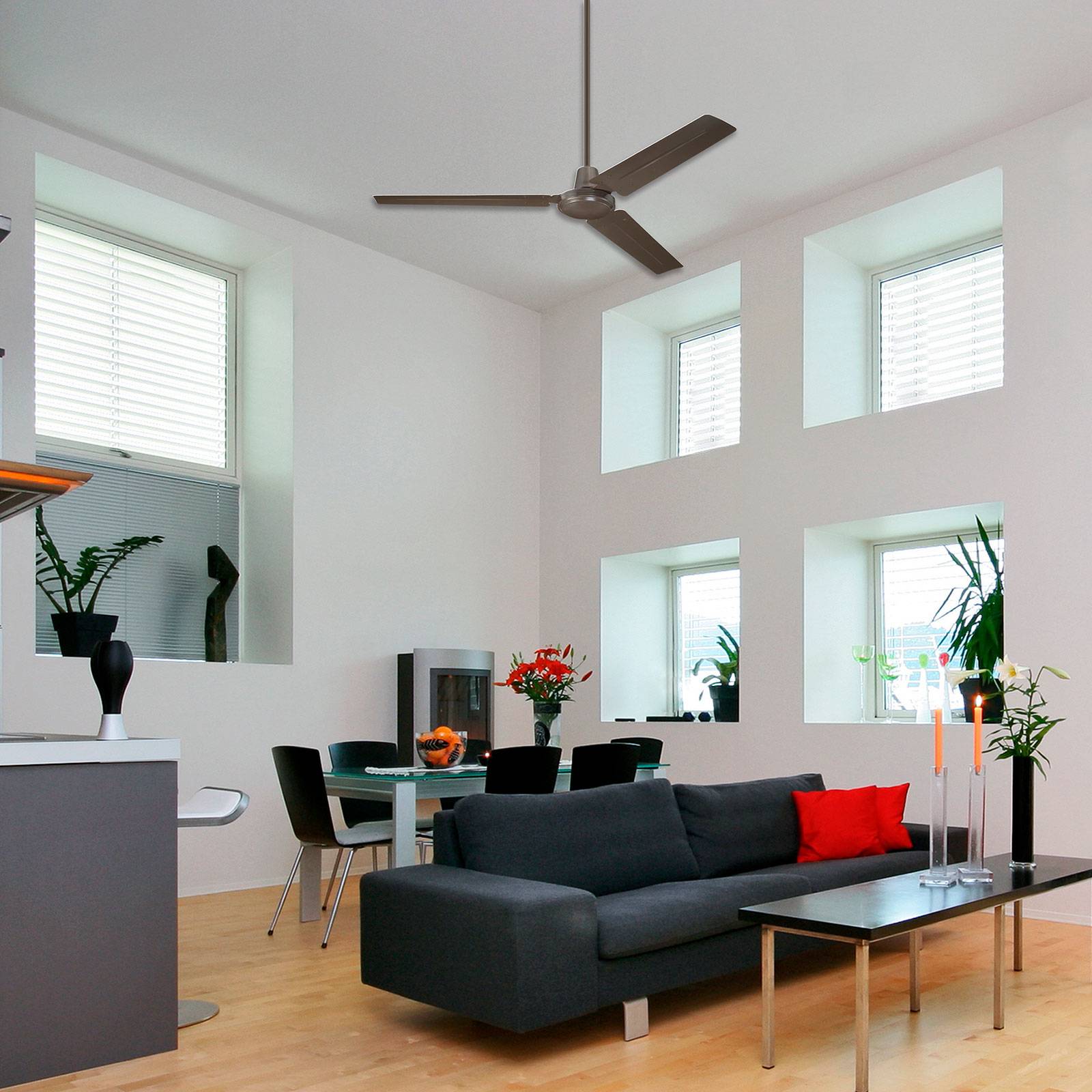 Efficiente ventilatore da soffitto Industrial Espresso L'efficiente ventilatore da soffitto Industrial Espresso di Westinghouse è adatto a tutte le stagioni grazie all'opzione di marcia avanti e indietro integrata. Il ventilatore da soffitto è stato progettato appositamente per stanze di dimensioni fino a 30 m². Il ventilatore da soffitto Industrial Espresso è dotato di una pratica opzione di avanzamento e inversione che può essere azionata individualmente tramite un interruttore a scorrimento sull'alloggiamento. Ciò consente di risparmiare notevolmente sui costi di riscaldamento in inverno. In estate, l'aria della stanza viene piacevolmente rinfrescata e viene azionata tramite un interruttore a parete. Se il dispositivo deve essere controllato tramite un telecomando, questo può essere ordinato separatamente come accessorio. I rotori possono funzionare a quattro velocità diverse e l'uso del telecomando opzionale è limitato da 4 a 3 livelli di velocità. Dati tecnici Potenza per velocità: - 11 watt a 91 giri/min - 26,6 watt a 138 giri/min - 51,1 watt a 192 giri/min - 61,8 watt a 213 giri/min Caratteristiche speciali Il motore di questo ventilatore è estremamente silenzioso e rende Industrial Espresso ideale per l'uso in camera da letto.