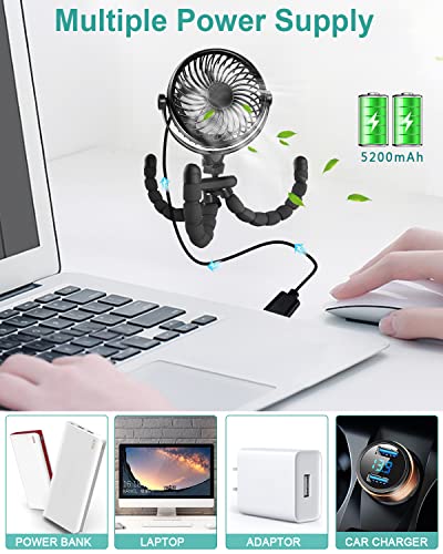 Ventilatore USB da Tavolo, Ventilatore Versatile con Flessibile Treppiede, Batteria da 5200mAh, 4 velocità, Silenzioso Portatile Ventola Rotante a 360 ° per Passeggino, Tapis Roulant, Tenda, Viaggiare