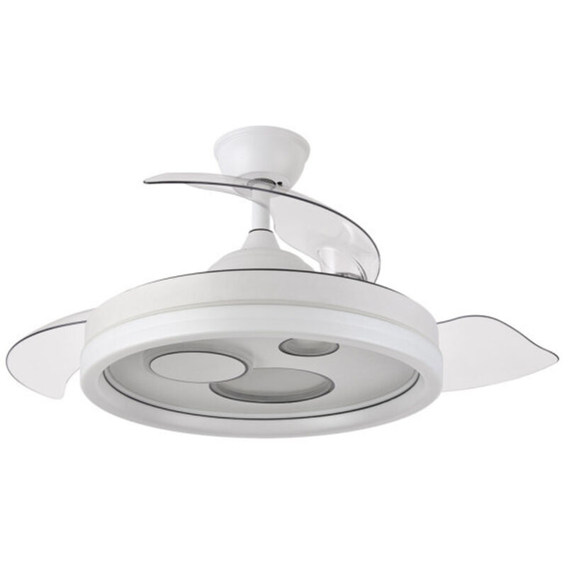 Ventola DC della serie TURIA in metallo, policarbonato e ABS, di colore BIANCO con tre pale DEPLOYABLE in ABS trasparente molto resistenti. Design molto moderno ed originale, con un bellissimo gioco di luci. Ha sei velocità regolabili. Tecnologia LED i