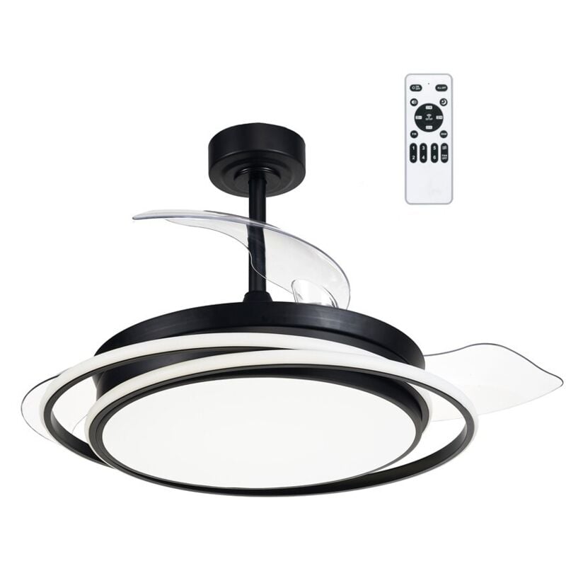 Ventilatore da soffitto LED Antila nero . Ventilatore con motore DC ultrasilenzioso a sei velocità di rotazione, funzione inverno, estate e inversione brezza. Il suo design con pale retrattili fa sì che quando il ventilatore non è in funzione, vengano raccolte sopra il ventilatore. Questi tipi di ventilatori sono molto pratici per illuminare una stanza come un soggiorno o una grande camera da letto. Puoi controllare la luce individualmente, accendendo solo la luce principale, solo l'anello decorativo o l'intera ventola contemporaneamente secondo necessità. Illuminazione LED dimmerabile con tre tonalità di temperatura colore. Montaggio e installazione del ventilatore da soffitto ANTILA