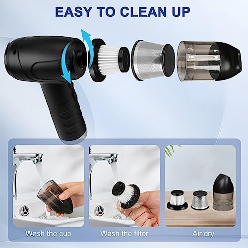 【Doppio Sistema di Filtro HEPA】Il soffiatore ad aria compressa è dotato di un grande motore turbo brushless ad alta velocità da 90W con nucleo in rame puro, che può facilmente eliminare polvere, residui, ritagli di carta, pelle, peli di animali, ecc. Adotta un filtro HEPA molto efficiente per filtrare la polvere fine e il filtro può essere lavato più volte. La scatola per la polvere non solo ha una grande capacità di 150 ml, ma è anche facile da rimuovere e comoda da pulire.