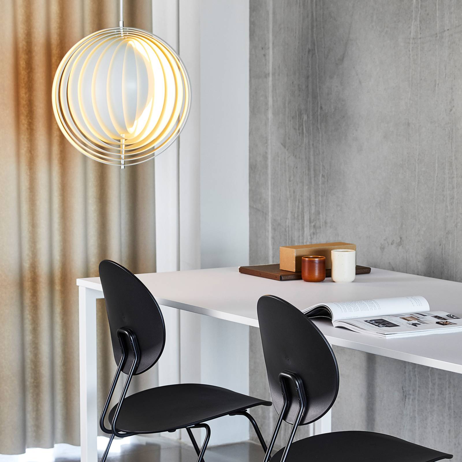 Apparecchio a sospensione di design sferico Moon con lamelle in alluminio - di Verner Panton Uno dei primi apparecchi progettati da Verner Panton è stato il lampadario a sospensione Moon, con il quale l'icona del design ha lanciato uno stile creativo completamente nuovo. Anche con le sue creazioni di mobili, Panton si è posto l'obiettivo di creare qualcosa di più di semplici arredi. Quello che è uscito dalla penna di Verner Panton è sempre andato al di là di ciò che era noto in precedenza. Le sue creazioni non erano solo destinate a completare l'arredamento d'interni, ma a fungere da sculture eleganti, spaziose e centrali. L'entusiasmo internazionale di cui l'apparecchio a sospensione Moon continua a godere anche oggi dimostra che Panton ha fatto una dichiarazione con il suo primo progetto di apparecchio di illuminazione. Dieci lamelle in alluminio laccato bianco sovrapposte una all'altra formano il corpo di questo ingegnoso apparecchio a sospensione. Le lamelle, che aumentano di diametro dall'interno verso l'esterno, sono mobili e possono essere girate singolarmente una sopra l'altra. Il fascino di questa lampada a sospensione, come di numerosi altri disegni di Verner Panton, si ritrova nel dettaglio. Una volta sagomate, le lamelle nascondono completamente la fonte di luce centrale, ma riflettono la luce in entrata attraverso gli interstizi verso l'esterno, creando un gioco di luce senza precedenti, perfettamente privo di abbagliamento, che cambierà completamente l'atmosfera della stanza. Poiché la posizione delle singole lamelle è variabile, l'apparecchio a sospensione Moon consente un'ampia varietà di progettazione illuminotecnica. Come la luna, che cambia continuamente forma nel cielo notturno, l'apparecchio di Verner Panton è un oggetto di design dalle molteplici sfaccettature. La nuova edizione dell'apparecchio a sospensione Moon è firmata da Verner Panton e si trova nella parte più interna delle dieci lamelle.