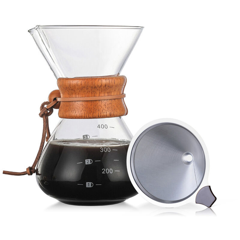 Caffettiera pour over senza carta realizzata in vetro borosilicato di prima qualita, con filtro in acciaio inossidabile a doppio strato. Semplice, facile da usare con un design elegante e senza tempo. Caratteristiche: Realizzato in vetro borosilicato di alta qualita con filtro in acciaio inossidabile a doppio strato. Manico in legno robusto e resistente al calore, che protegge le mani da scottature durante il versamento. Filtro fine in acciaio inossidabile per ridurre al minimo la quantita di terreno residuo senza carta da filtro, risparmiare energia. Design estetico semplice ma elegante, offre un look unico da integrare con la tua casa. Ti consente di preparare il caffe in base alle tue esigenze, comodo da pulire, perfetto per la famiglia e l'ufficio. Specifiche: Materiale: vetro borosilicato + acciaio inossidabile + legno Capacita: 14oz / 20oz / 27oz (Opzionale) Dimensione articolo: 14 once: 10 * 6 * 16,5 cm / 3,9 * 2,4 * 6,5 pollici 20 once: 12 * 8 * 20 cm / 4,7 * 3,1 * 7,9 pollici