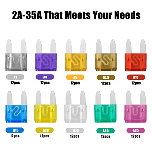 【La confezione include】 Questo kit assortito di fusibili per auto include una piccola clip e 120 mini fusibili: 2Ax12, 3Ax12, 5Ax12, 7.5Ax12, 10Ax12, 15Ax12, 20Ax12, 25Ax12, 30Ax12, 35Ax12, sufficienti per l'uso quotidiano.