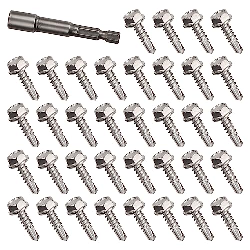 Vesaneae 100 pezzi Viti Autofilettanti Testa Esagonale M4,2 x 16 mm + 1 Chiave a Bussola, viti autoforanti in acciaio inox 410, Viti Autoperforanti per fissaggio carrozzeria Legno Lamiera