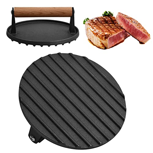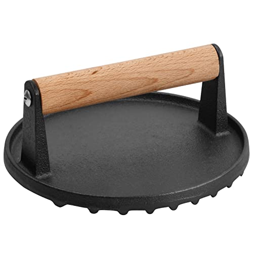 Vesaneae Pressa per Hamburger in Ghisa Antiaderente, Pressa per Carne per BBQ, Pressa per Carne in Ghisa Resistente con Manico in Legno, Pressa per Hamburger da Bistecca e Bacon, Rotondo da 17,5 cm