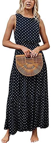 Vestito Lungo Donna Estivo Abito da Sera Cerimonia Girocollo Senza Maniche con Stampa a Pois Maxi Vestito Elegante Vintage (Navy Blue, M)