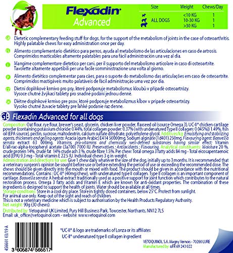 Flexadin advanced supporta il metabolismo articolare del cane, soprattutto in caso di soggetti anziani in cui è presente osteoartrosi o in soggetti sani sottoposti a impegni fisici importanti (cani da soccorso, cani sportivi, etc.)