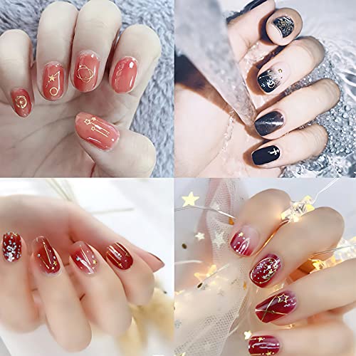 Design raffinato e varietà abbondante: Riceverai 12 adesivi decorativi per unghie in fogli: Stelle, luna, fiori, linea metallica, lettera, motivi a cuori d'amore. Questi modelli possono facilmente creare un design unico per nail art, possono rendere le tue unghie più eleganti e professionali.
