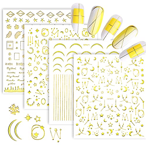 VETPW 12 Fogli 3D Oro Adesivi Unghie Decalcomanie, Stella Luna Adesivi per Unghie Autoadesivi Nail Art Decalcomanie Striping Tape line Decorazione Unghie, Unghie Manicure le Punte Decorazioni