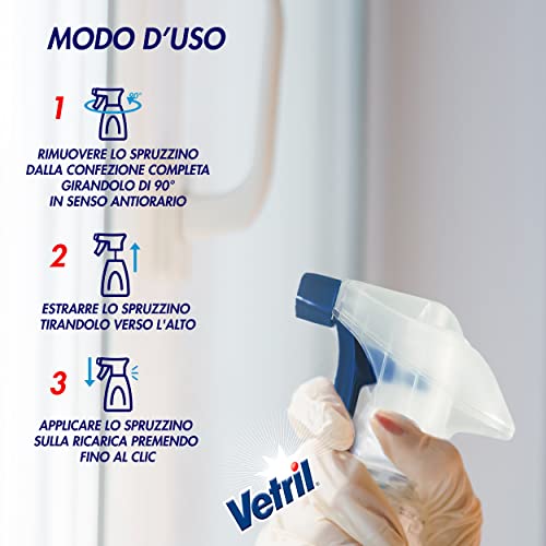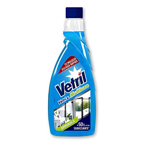 Vetril - Ricarica per Detergente Spray Vetri e Multiuso con Ammoniaca, Azione Sgrassante e Tecnologia Asciuga Rapido, in Ecoflacone, 650 ml x 12 Pezzi