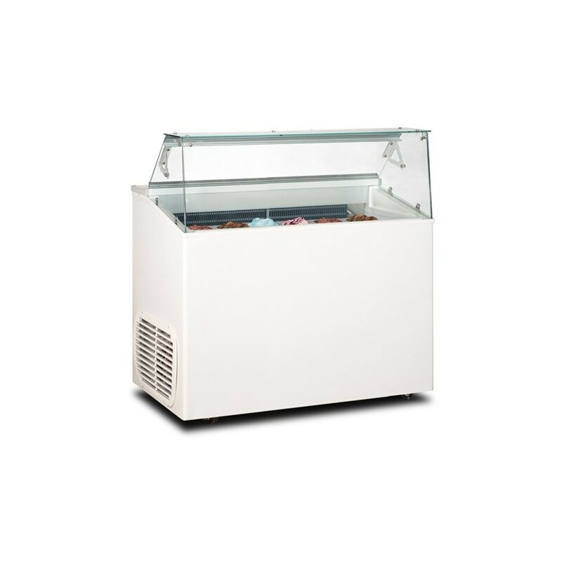 Codice RS2125 - Vetrina gelato modello MG-TOP6, dimensioni cm. 120x67.3x117.5 (lxpxh), temperatura di esercizio -15/-20 °C, 230 volt, 420 watt, evaporatore statico a pacco alettato (con resistenza di sbrinamento) più serpentina schiumata nelle pareti. Sistema condensante a pacco alettato con motoventilatore. Compressore ermetico con protettore. Sbrinamento automatico. Struttura superiore con vetri piani e ribaltina. Luce interna fluorescente con interruttore. 4 ruote pivottanti. Vano sottostante per la riserva con sportello. Capacità espositiva n.6 vaschette da lt. 5 (6+6 lt. 2.5 optional). Capacità cella riserva n.8 vaschette da lt. 5 (oppure n.18 vaschette da lt. 2.5). Vaschette non comprese nella fornitura.