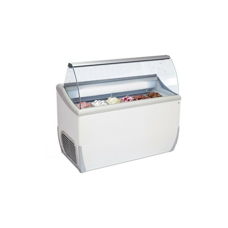 Codice RS2128 - Vetrina gelato modello MG-J9 EXTRA, dimensioni cm. 165.6x72.3x125.3 (lxpxh), temperatura di esercizio -15/-20 °C, 230 volt, 500 watt, evaporatore statico a pacco alettato (con resistenza di sbrinamento) più serpentina schiumata nelle pareti. Sistema condensante a pacco alettato con motoventilatore. Compressore ermetico con protettore. Sbrinamento automatico. Struttura superiore con vetri curvi e ribaltina. Luce interna fluorescente con interruttore. 4 ruote pivottanti. Vano sottostante per la riserva con sportello. Capacità espositiva n.9 vaschette da lt. 5 (9+9 lt. 2.5 optional). Capacità cella riserva n.16 vaschette da lt. 5 (oppure n.36 vaschette da lt. 2.5). Vaschette non comprese nella fornitura.
