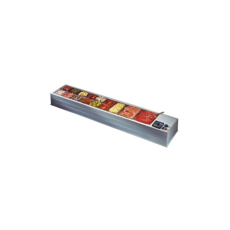 Codice RS2251 - Frigorifero da banco modello TC-MAXI, dimensioni cm. 208x41x22 (lxpxh), peso 30 kg, temperatura di esercizio +2/+10°C, 230 volt, 180 watt, vaschette e coperchi in acciaio inox o policarbonato disponibili in varie combinazioni di dimensioni (OPTIONAL a richiesta). Disponibile nei colori: bianco. A richiesta: supporto per il montaggio elevato sopra il banco, vetrinetta superiore in plexiglass. Isolamento ECO senza CFC. Struttura in materiale plastico ad alta resistenza (ABS): questo permette di avere macchine più leggere, con bordi arrotondati esternamente ed internamente, con superfici antiriflettenti. Evaporatore in rame. Compressore silenzioso, basso consumo di energia, facile manutenzione, pulizia facilitata.