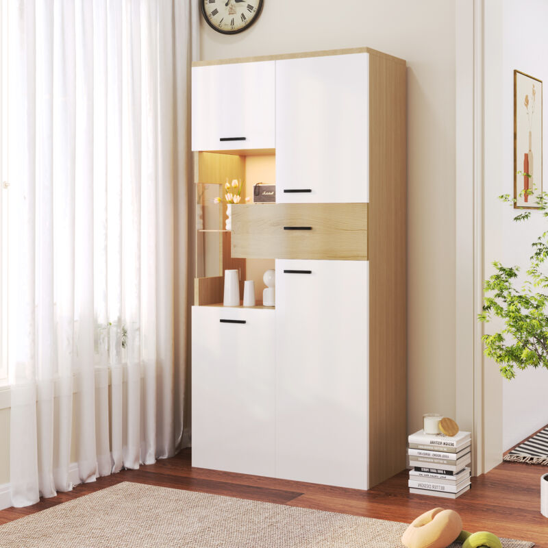 Descrizione dettagliata Questo mobile alto presenta un design moderno e minimalista nei colori bianco lucido e rovere, che lo rendono un'aggiunta elegante a qualsiasi stanza. Offre molto spazio verticale con ripiani multipli, perfetti per libri, decorazioni o utensili da cucina. Fianchi e ripiani in vetro, valorizzati dall'illuminazione a LED, aggiungono un tocco di eleganza. È ideale per diversi ambienti come il soggiorno, la camera da letto o la sala da pranzo e unisce armoniosamente funzionalità e stile. Le innovative strisce LED controllate da app ti consentono di controllare le luci che cambiano colore tramite un'app mobile che risponde alla musica e ai suoni e può essere programmata in base alle tue esigenze. Basta scansionare il codice QR sulla confezione per connettersi tramite Bluetooth e iniziare subito. Questo mobile alto non solo migliora l'estetica del tuo spazio, ma offre anche pratiche soluzioni di stoccaggio, rendendolo un'aggiunta versatile e preziosa al tuo design
