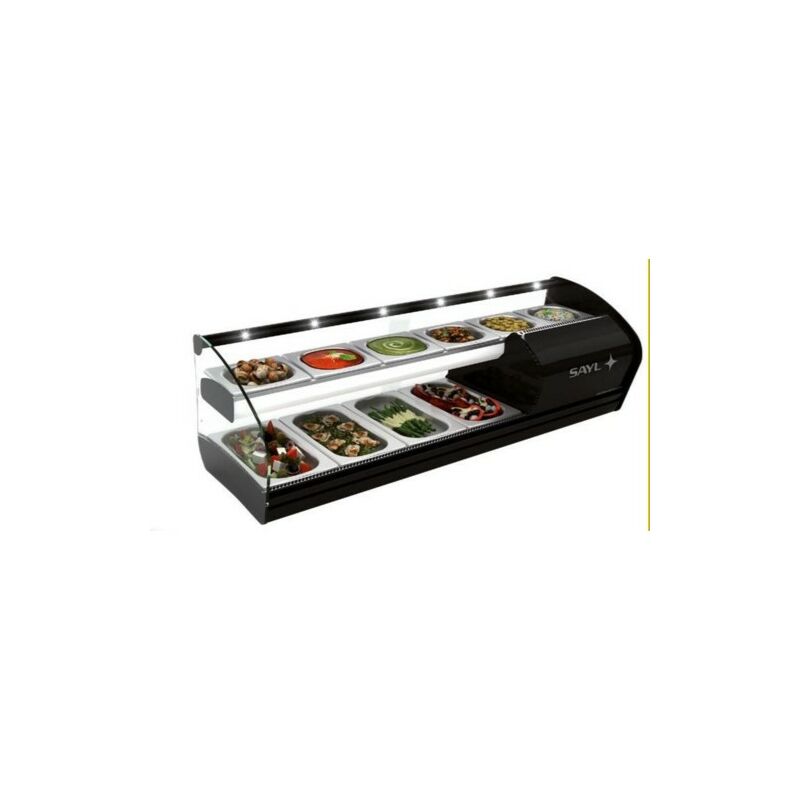 Codice RS3581 - Vetrina refrigerata da banco, modello HC-V46, dimensioni cm. 108.5x39.5x34 (lxpxh), capacità n.4 contenitori GN1/3 h.40 mm e n.6 contenitori GN1/6 h.40 mm (di serie), temperatura di esercizio +2/+5°C, 230 volt, 202 watt, peso 42 kg. Refrigerazione statica. Vetrina di pregevole design, permette ampia visibilità dei prodotti esposti. Esclusivo sistema di raffreddamento su due livelli. Realizzata con solida costruzione in acciaio inox e cristallo temperato. Illuminazione a LED su due livelli. Porte posteriori scorrevoli e facilmente estraibili per il caricamento dei prodotti. Cristallo frontale curvo e ribaltabile per facilitare la pulizia. Gruppo di refrigerazione incorporato e posizionato a destra del lato operatore, equipaggiato di compressore ermetico silenziato con doppio condensatore ventilato. La sede del compressore è realizzata per evitare l'espulsione di aria calda diretta al cliente o all'operatore (uscita laterale). Termostato elettronico regolabile.