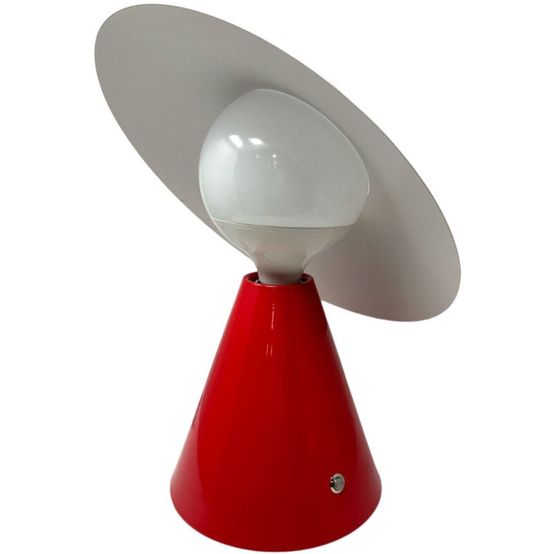 Particolare lampada da tavolo dallo stile contemporaneo. Una soluzione senza snodi, nella sua misurata linearità formale, l'orientamento della luce nell'ambiente avviene attraverso l'inclinazione manuale di un piatto appoggiato su una lampadina, che ricorda un cappellino di una signora d'altri tempi. Grazie al riflettore orientabile, diffonde una luce sul piano d'appoggio e una più diffusa verso l'alto. Attacco: E27 (lampadina non inclusa) Colore: Rosso Materiale: Metallo Tensione di ingresso:110-240V 50Hz Dimensioni base: 19x17 cm Diametro cappello: 30 cm Foro cappello: 11,5 cm circa Lunghezza cavo alimentazione: 1,8metri Peso: 1,4 Kg