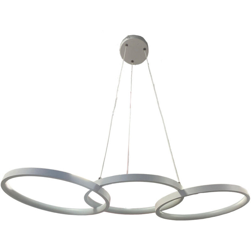 Lampadario a led dal design moderno costituito da tre cerchi sospesi, altezza regolabile. Si integra alla perfezione in un ambiente arredati in stile moderno o contemporaneo, con luce led integrata. Di semplice installazione a soffitto e non richiede particolari accorgimenti. Potenza: 45 watt Flusso Luminoso: 3600 Lm Fascio Luminoso: 180° Gradi Kelvin: Luce naturale 4000k Indice di resa: CRI:Ra> 80 - Alimentazione: AC 220-240V 50/60Hz Materiale: Vernice di allumino + PVC Dimensioni: H 110 cm L 79 cm Altezza cerchi: 3.2 cm Peso: 1.0 Kg