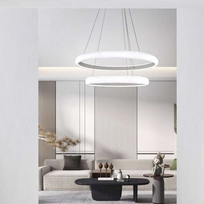 Lampadario pendente dal design moderno realizzato in alluminio e cristalli in acrilico composto da 2 cerchi di diverse misure che possiamo regolare in altezza creando forme diverse per illuminare e decorare allo stesso tempo ambienti interni. Potenza: 51 watt Flusso luminoso: 4080 Lm Angolo luminoso: 120° Temperatura della Luce: 3000K Tensione di ingresso: AC 220-240V 50/60Hz Colore: Bianco Materiale: Alluminio - Acrilico Diametro Anelli: 590 - 430 mm circa Altezza regolabile: 1200 mm Diametro base: 200 mm Peso: 2.1 Kg