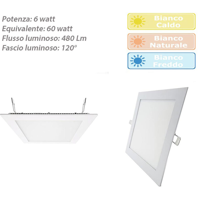 Pannello led ad incasso completo di driver, struttura in plastica con rifiniture bianche, per montaggio a soffitto. Il prodotto è indicato per controsoffittature ma anche per illuminare garage sotterranei, sottopassi, parcheggi, uffici, supermercati ed in generale ampie superfici commerciali e industriali. Consumo e sorgente luminosa: 6 watt Potenza (equivalente ad incandescenza): 60 W Angolo di illuminazione: 120° circa Tipo di led: smd 2835 Intensità luminosa: 480 lumen Gradi kelvin 3000K OUTPUT DC14/12V 300mA± 5% Dimensioni: 12x12x12 cm Dimensioni retro: 10x10x10 cm Spessore: 1 cm
