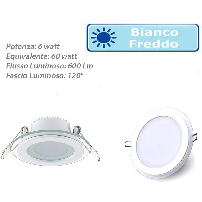Pannello led ad incasso completo di driver composto da una struttura con cornice in vetro trasparente, per montaggio a soffitto. Il prodotto è indicato per controsoffittature ma anche per illuminare garage sotterranei, sottopassi, parcheggi, uffici, supermercati ed in generale ampie superfici commerciali e industriali. Completo di led driver e molle per il bloccaggio a soffitto. Potenza: 6 watt equivalente ad incandescenza 60 W Angolo di illuminazione: 120° circa Tipo di led: smd 2835 Intensità luminosa: 600 lumen Gradi kalvin: 6500k. INPUT ac85-265V 50/60HZ - OUTPUT DC12/28V 300mA± 5% Vita media: 30000h. Diametro: 100 mm Foro d'incasso: 75 mm.