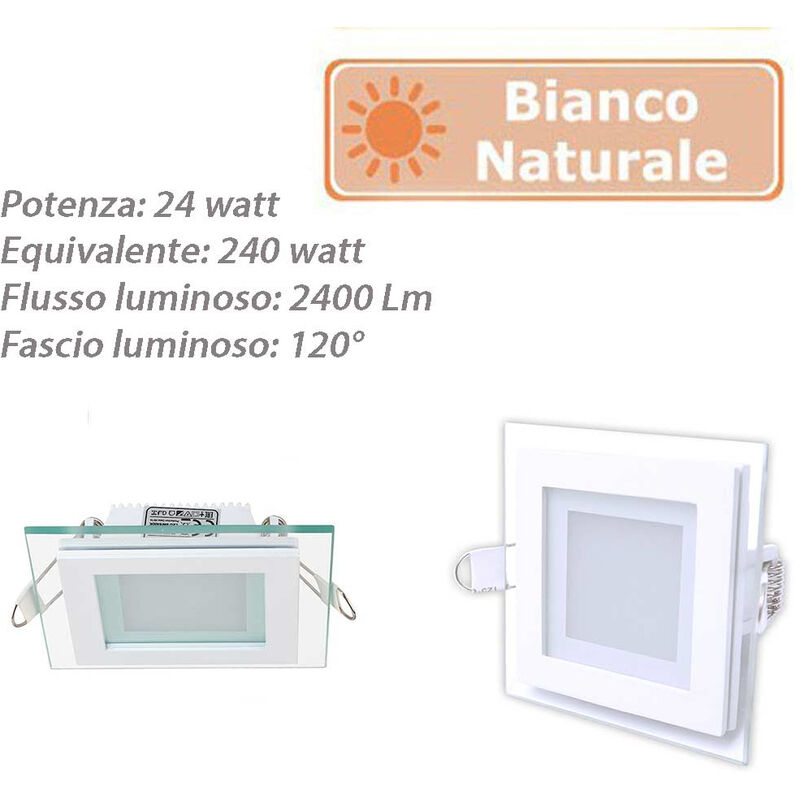 Pannello led ad incasso completo di driver composto da una struttura con cornice in vetro trasparente, per montaggio a soffitto. Il prodotto è indicato per controsoffittature ma anche per illuminare garage sotterranei, sottopassi, parcheggi, uffici, supermercati ed in generale ampie superfici commerciali e industriali. Completo di led driver e molle per il bloccaggio a soffitto. Potenza: 24 watt equivalente ad incandescenza 240 W Angolo di illuminazione: 120° circa Tipo di led: smd 2835 Intensità luminosa: 2400 lumen Gradi kelvin: 4000k. INPUT ac85-265V 50/60HZ - OUTPUT DC54/100V 300mA± 5% Vita media: 30000h. Diametro: 240x240 mm - Foro d'incasso: 205x205 mm
