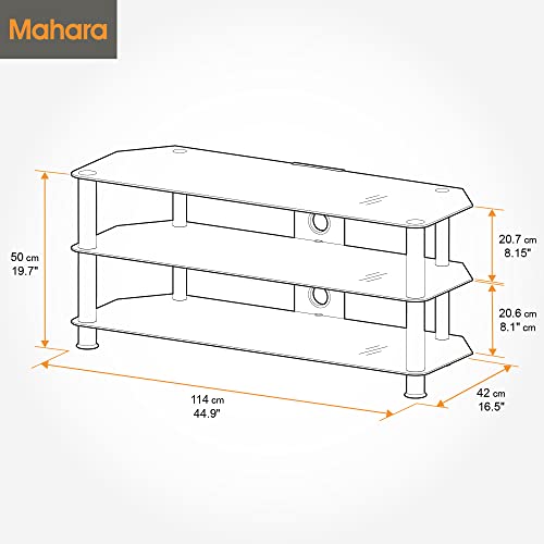 Il ripiano superiore in vetro è spesso 8 mm e può sostenere una TV fino a 45 kg in tutta sicurezza.