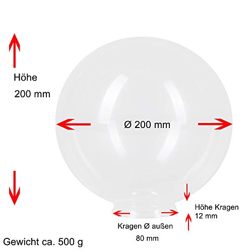 Vetro sferico trasparente per lampada, diametro 200 mm, rotondo, vetro di ricambio, bordo del colletto, 80 mm, E27, vetro trasparente