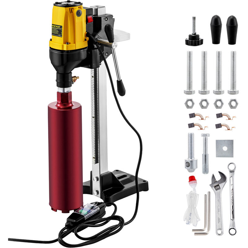 Impianto di Perforazione a Carotaggio Diamantato Motore in rame puro e 1600 giri/min e antiruggine Una perforatrice diamantata è uno strumento che perfora su cemento armato, muratura, roccia, ceramica e refrattari. In considerazione della vostra sicurezza, la carotatrice è dotata di un interruttore di protezione personale. È uno strumento essenziale per l'esecuzione di lavori industriali e di fabbricazione dell'acciaio per impieghi gravosi. Diametro di perforazione massimo di 6,3 pollici Costruzione durevole Design di sicurezza premuroso Impugnatura ergonomica e base stabile Caratteristiche & Dettagli Diametro di Perforazione Massimo di 6,3 pollici: la nostra carotatrice genera potenza estrema grazie al suo motore in rame da 2180 W. Velocità massima: 1600 giri/min. Diametro massimo del carotaggio: 6,3"/160 mm. Ancora più importante, è inclusa la corona da 4,25"/108 mm nell'immagine. Costruzione Durevole: poiché la macchina funzionerà a testa in giù, l'acqua scorrerà inevitabile sul
