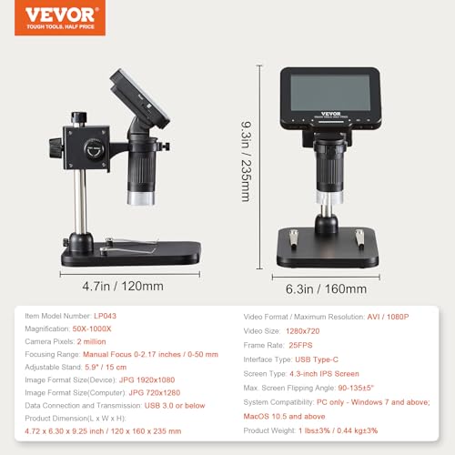 VEVOR Microscopio Digitale Endoscopio USB HDMI Ingrandimento 50X-1000X Schermo 4,3 Pollici Funzioni Foto Video Messa a Fuoco Manuale 0-50mm, Microscopio da Banco Riparazione Saldatura Visualizzazione
