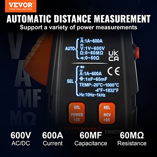 VEVOR Pinza Amperometrica Multimetro Digitale TRMS Lettura Max. 5999 Corrente CA 60A / 600A Temp. -20℃ a 1000℃, Pinza di Amperometro Misuratore di Corrente per Tensione Corrente Resistenza Misura NCV