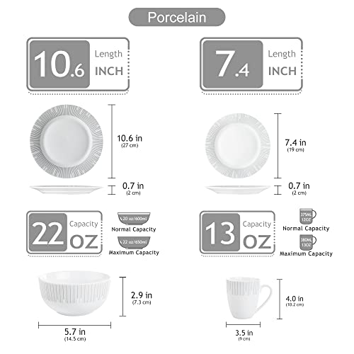 Servizio di Piatti con 16 Pezzi: 4 tazze da caffè (380 ml, altezza 10,2 cm), 4 piatti da dessert (7,5 "/19 x 2 cm), 4 piatti piani (10,5 "/27 x 2 cm), 4 ciotole (650 ml, φ 5,7 "/14,5 cm x 7,3 cm).