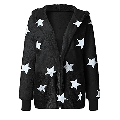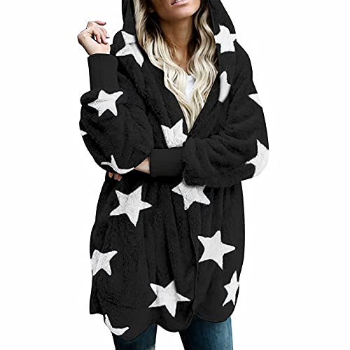 Vexiangni Giacca in pile con cappuccio, da donna, calda, in pile Teddy, cappotto invernale in pile leopardato, casual, chiusura lampo, con tasche, A nero, L