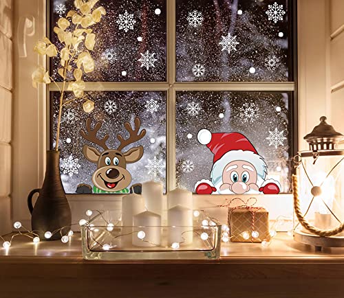 VEYLIN Adesivi natalizi per finestre, 6 fogli che fanno capolino con Babbo Natale e Rudolph, fiocchi di neve adesivi per finestre in PVC per vetrine natalizie