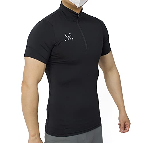 Vf VFIT Maglietta Compressione Uomo Manica Corta con Cerniera Sportiva Fitness (L, Nero)