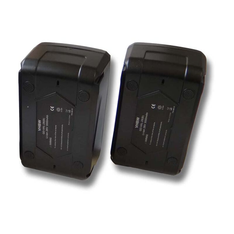 Vhbw - the clever way - Batteria ricaricabile di ricambio, compatibile e di alta qualità, ad alta capacità, per strumenti da lavoro come trapani, levigatrici, smerigliatrici, avvitatori elettrici, reggiatrici, radio, seghe e tagliaerba - La batteria soddisfa tutte le principali norme di sicurezza operativa - È adatta anche come batteria di riserva in caso di viaggio CONTENUTO DELLA SPEDIZIONE: - 2x batteria SPECIFICHE TECNICHE: - Tecnologia: Li-Ion - no effetto memoria - Capacità: 3000 mAh - Tensione: 28 V - Energia: 84 Wh - Colore: nero Per garantire la compatibilità, verificare se la batteria ricaricabile attualmente in uso è presente nell'elenco. SOSTITUISCE: - AEG / Milwaukee 48-11-1830, 48-11-2830, 48-11-2850, M28B, 4932352732 Accessori e pezzi di ricambio di alta qualità. Per prolungare la durata di vita dei Suoi apparecchi elettrici.