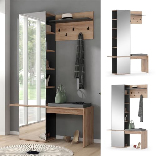 Il mobile ingresso offre un grande specchio, un comodo sedile imbottito e 4 ganci per appendere gacche e sovrabiti. Pratico e funzionale per l'ingresso di casa.