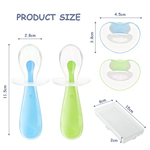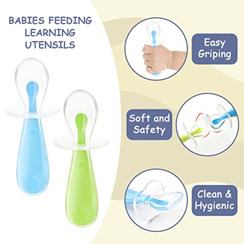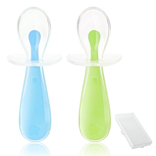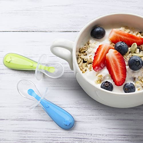 Vicloon Cucchiaino Svezzamento, 2 Pezzi Cucchiaino Silicone Neonato, Cucchiai per Bambini con Deflettore, Cucchiaini per Alimentazione per Bambini Senza BPA, Lavabili in Lavastoviglie (Blu e Verde)