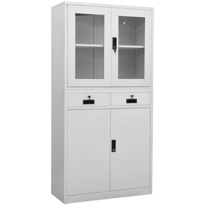 Questo armadio per ufficio, grazie al tipico design a schedario, è ideale per la conservazione dei fascicoli. Questo mobile da ufficio è realizzato in acciaio, che lo rende resistente e facile da pulire. Con 3 ripiani regolabili, questo schedario vi consente di mantenere ordinatamente i vostri file in diverse categorie e di tenerli al sicuro. Le 2 ante nella parte superiore hanno una finestra in vetro temperato, che vi aiuta a trovare facilmente i file che desiderate. I cassetti con guide su cuscinetti a sfera a 3 sezioni garantiscono un'apertura e una chiusura fluide, anche in condizioni di carico elevato. Questo mobiletto si adatta a qualsiasi arredamento d'ufficio grazie al suo design iconico. Colore: Grigio chiaro Materiale: Acciaio e vetro temperato Dimensioni: 90 x 40 x 180 cm (L x P x A) Con 3 ripiani regolabili Con serrature 4 ante (Le 2 ante superiori hanno la finestra in vetro temperato) 2 cassetti con guide a sfera a 3 sezioni Peso massimo supportato per ripiano: 30 kg