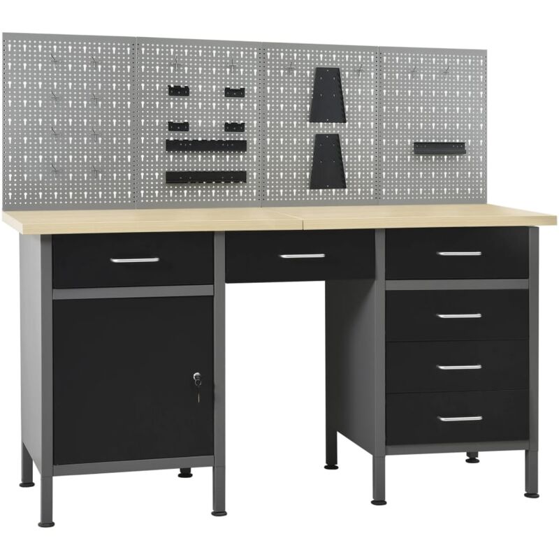 Questo set combina 1 banco da lavoro e 4 pannelli a parete e rappresenta una soluzione comoda per riporre gli attrezzi nell'officina o nel garage. Il banco di lavoro robusto, si distingue per l'ampio spazio di stoccaggio e la capacit di carico di 500 kg. Questo tavolo grande e robusto offre una piattaforma stabile per tutti i lavori di riparazione. Il banco da lavoro ha 6 cassetti, che consentono di organizzare bene strumenti, parti e accessori come viti, chiodi e nastro adesivo. Tutti i cassetti sono dotati di meccanismo di cuscinetti a sfere per uno scorrimento regolare. Ci sono 2 ripiani e un ampio scomparto con 2 ante bloccabili, per ospitare trapani, tamburi per cavi e smerigliatrici. Inoltre, i piedi sono regolabili in altezza. Questa workstation realizzata in acciaio e truciolare di alta qualit, il che la rende estremamente robusta, resistente e facile da pulire. 頦acile da montare. Questi pannelli per utensili sono realizzati in acciaio robusto per sostenere il peso di vari
