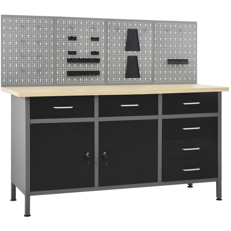 Questo set combina 1 banco da lavoro e 4 pannelli a parete e rappresenta una soluzione comoda per riporre gli attrezzi nell'officina o nel garage. Il banco di lavoro robusto, si distingue per l'ampio spazio di stoccaggio e la capacit� di carico di 500 kg. Questo tavolo grande e robusto offre una piattaforma stabile per tutti i lavori di riparazione. Il banco da lavoro ha 6 cassetti, che consentono di organizzare bene strumenti, parti e accessori come viti, chiodi e nastro adesivo. Tutti i cassetti sono dotati di meccanismo di cuscinetti a sfere per uno scorrimento regolare. Ci sono 2 ripiani e un ampio scomparto con 2 ante bloccabili, per ospitare trapani, tamburi per cavi e smerigliatrici. Inoltre, i piedi sono regolabili in altezza. Questa workstation � realizzata in acciaio e truciolare di alta qualit�, il che la rende estremamente robusta, resistente e facile da pulire. � facile da montare. Questi pannelli per utensili sono realizzati in acciaio robusto per sostenere il peso di