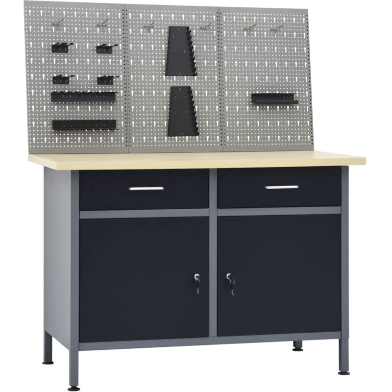 Questo prodotto combina 1 banco da lavoro e 3 pannelli a parete e rappresenta una soluzione comoda per riporre gli attrezzi nell'officina o nel garage. Questo banco da lavoro ad alta resistenza si distingue per l'ampio spazio dove riporre gli utensili e l'elevata capacit� di carico, pari a 500 kg. Questo banco da lavoro include 2 cassetti che consentono di organizzare al meglio strumenti, parti e accessori come viti, chiodi e nastro adesivo. I cassetti sono dotati di meccanismo a sfere per uno scorrimento dolce. Ci sono 2 ripiani e un ampio scomparto con 2 ante bloccabili, per alloggiare facilmente trapani, tamburi per cavi e smerigliatrici. Inoltre i piedi sono regolabili in altezza. Il banco da lavoro � realizzato in acciaio e truciolato di alta qualit�, materiali che rendono il prodotto estremamente robusto, resistente e facile da pulire. Il montaggio � semplice. I pannelli per utensili sono realizzati in acciaio solido per sostenere il peso di vari strumenti, come trapani, pinze