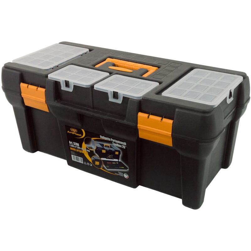 Questa cassetta degli attrezzi ha un interno spazioso che potete utilizzare per conservare martello, metro a nastro, cacciaviti, chiavi inglesi e molto altro. Materiale di prima qualit: Questa cassetta portautensili realizzata al 100% in PP (Polipropilene), il che la rende robusta, durevole e facile da pulire. Funzione di stoccaggio: Include quattro organizer superiori e un vassoio rimovibile adatto per contenere piccoli strumenti manuali, viti, dadi, bulloni e chiodi. Coperchio trasparente: Le coperture trasparenti a cerniera consentono una panoramica diretta del contenuto. Design con serratura: La cassetta degli attrezzi pu essere bloccata con un lucchetto (non incluso) per impedire l'accesso non autorizzato. Colore: nero e giallo Materiale: 100% PP (polipropilene) Dimensioni: 580 x 280 x 250 mm (L x P x A) Peso netto: 2,53 kg Riciclabile, conforme alla normativa REACH Antiurto, resistente al freddo Resistente agli oli e ai solventi Non assorbe l'umidit Chiusura a clip resistente