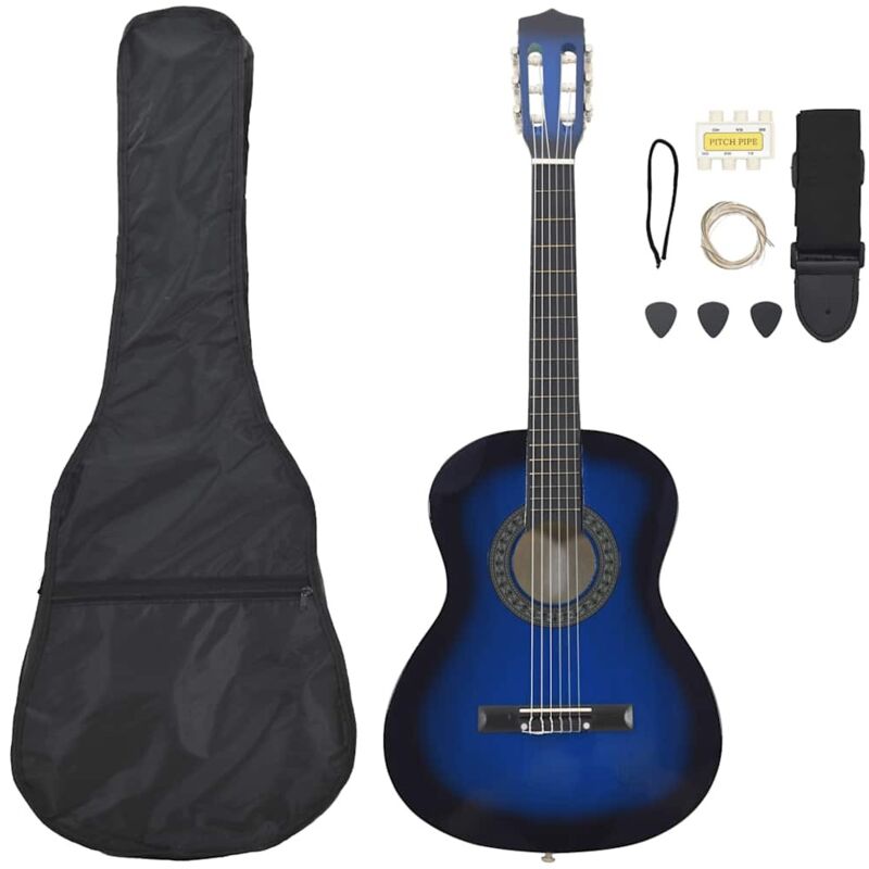La nostra chitarra classica è un ottimo strumento per bambini, principianti e dilettanti. Oltre a una chitarra, il pacchetto include una borsa per chitarra, un cinturino, un plettro, un accordatore a bocca e un set di corde per chitarra. Questa chitarra è realizzata in legno massello di tiglio con pulsanti e tastiera in plastica rigida. L'eccellente qualità del suono e il bellissimo design classico la rendono molto preziosa. Con una scala di 58,5 cm, questa chitarra ha tutto il necessario per aiutarvi a diventare il prossimo grande chitarrista. I 3 plettri vengono utilizzate per pizzicare le corde. Di solito il plettro è un sostituto delle dita, ma può anche essere utilizzato insieme alle dita. L'accordatore a bocca può aiutare ad accordare la chitarra. La borsa inclusa con tracolla è perfetta per i musicisti che viaggiano e per una facile conservazione. Il nostro set di chitarra è facile da montare. Specificazioni: Colore: Blu Materiale: Legno di tiglio, nylon, plastica dura