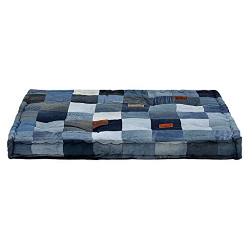 Rendete più confortevole il vostro divano su pallet grazie a questo set di cuscini con motivo patchwork in tessuto denim riciclato!