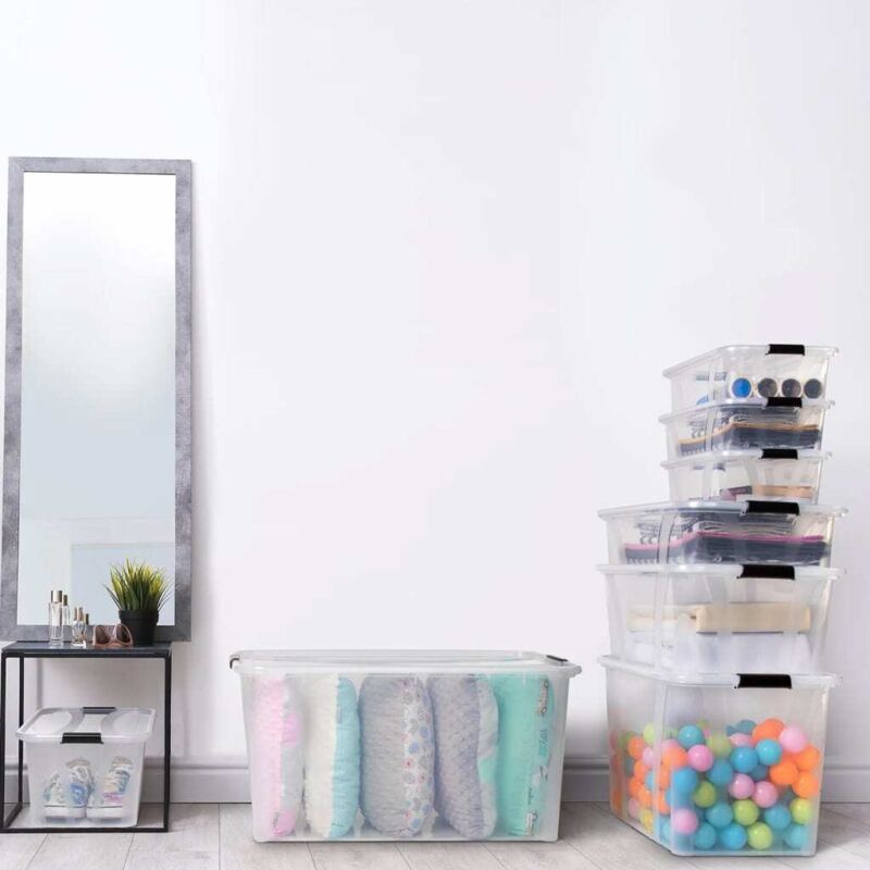 Queste scatole di immagazzinaggio sono fantastiche per depositare tutti i piccoli oggetti della vita. Sono perfette per organizzare, riordinare e smistare. Questi contenitori per la conservazione sono realizzati al 100% in PP (polipropilene), il che li rende robusti, durevoli e facili da pulire. Le basi trasparenti consentono di vedere a colpo d'occhio il contenuto della scatola. Grazie al design impilabile, i contenitori di stoccaggio sono riponibili quando non vengono utilizzati per risparmiare spazio di stoccaggio. I fermi fermi su entrambi i lati possono essere fissati saldamente alla scanalatura sul coperchio, proteggendo il contenuto della scatola dallo sporco e dall'umidità. Inoltre, le scatole sono adatte agli alimenti, quindi sono adatte anche per conservare condimenti, spezie, spuntini, bevande e altri alimenti. Colore: Trasparente e nero Materiale: 100% PP (polipropilene) Dimensioni: 385 x 254 x 185 mm (L x P x A) Capacità: 14 L Peso netto (per scatola): 462 g Montaggio