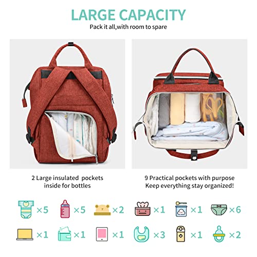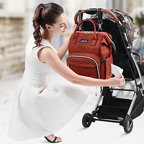 Viedouce Borsa per Pannolini Zaino Fasciatoio, Zaino Mamma,Impermeabile Resistente Ai Graffi Stoffa Oxford Grande Capacità Borsa, con Fasciatoio Portatile e 2 Ganci di Passeggino (Rosso mattone)