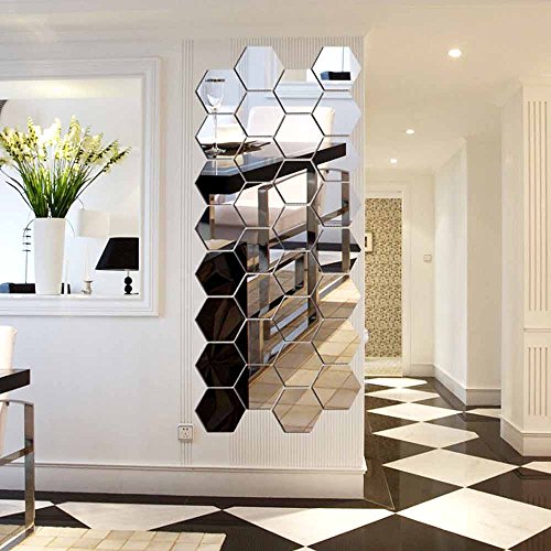 Vigorfun - 12 piastrelle a specchio autoadesive, a forma di esagone, per decorazione da parete (12 pezzi, argento)